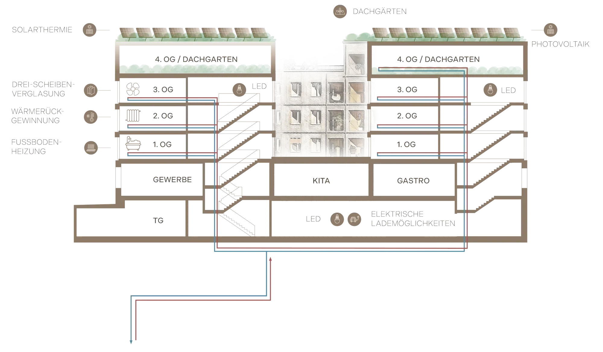 Im Quartier stehen 69 Pkw-Stellplätze, teilweise mit installierten E-Ladestationen oder vorgerüsteter Ladeinfrastruktur zur Verfügung. Zum Konzept gehören außerdem drei Carsharing-Elektrofahrzeuge, die Bewohnern eine einfache und nachhaltige Alternative zum eigenen Auto bieten.