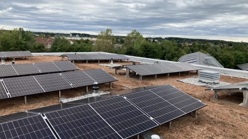Gebäude mit Flachdächern, wie die Hauptgebäude des HOKI-Living Holzkirchen, eignen sich ideal für die Installation von Photovoltaikanlagen. Die horizontale Anordnung der Solarelemente ermöglicht die optimale Nutzung der Sonneneinstrahlung zur Erzeugung von grünem Strom – effizient, klimafreundlich und über alle Jahreszeiten hinweg konstant. So trägt die Photovoltaik maßgeblich zur Energieeffizienz und CO₂-Reduktion des gesamten Quartiers bei und ist ein zentraler Bestandteil des nachhaltigen Energiekonzepts von HOKI-Living.