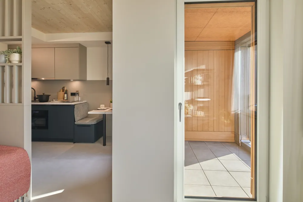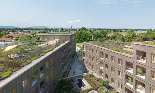 Die begrünten Dachflächen bieten nicht nur Bergblick und hohe Aufenthaltsqualität, sondern auch einen ökologischen Mehrwert für das Quartier. Sie wirken wärmedämmend, fördern die Biodiversität und tragen aktiv zur Klimaanpassung im urbanen Raum bei. Damit verbinden die Gemeinschaftsterrassen Nachhaltigkeit, Architektur und Lebensqualität – ein weiteres Beispiel für das durchdachte Wohnkonzept von HOKI-Living.