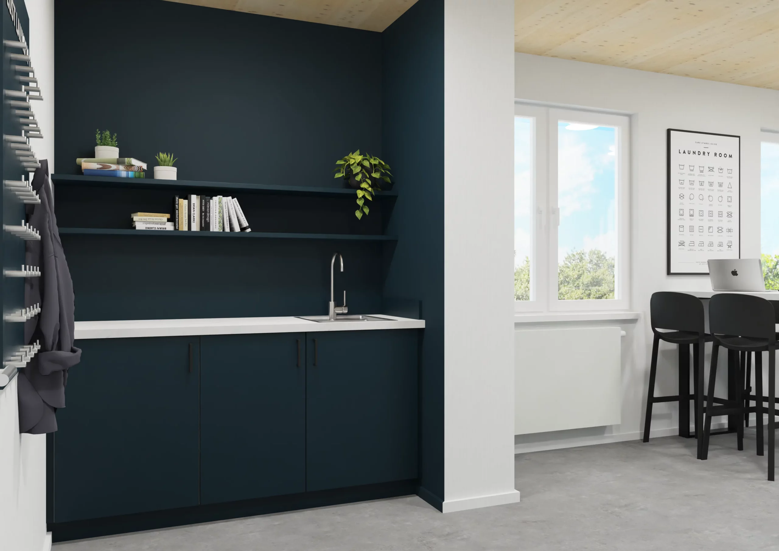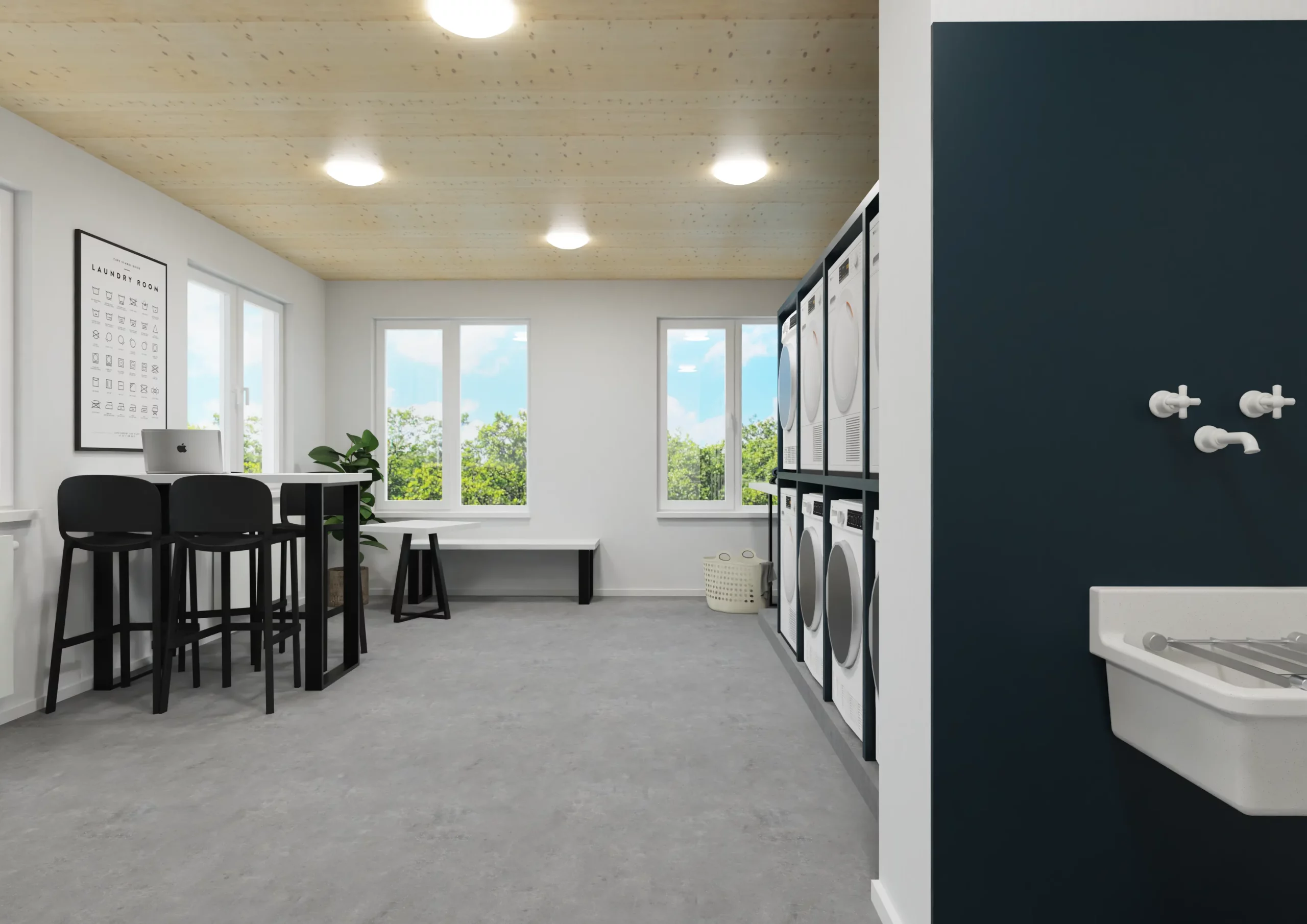 Im 4. Obergeschoss des HOKI-Living Holzkirchen befindet sich eine lichtdurchflutete Wasch-lounge mit digital gesteuerten Waschmaschinen und Trocknern. Über eine App-Steuerung können Bewohner die Verfügbarkeit der Geräte prüfen, den Status ihrer Wäsche verfolgen und bargeldlos bezahlen – komfortabel, effizient und ressourcenschonend.