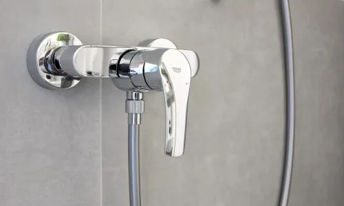 Einhebel-Mischarmatur für die präzise Wärmeregulierung sorgt für höchsten Komfort und ein angenehmes Duscherlebnis – Teil der hochwertigen Badausstattung im HOKI-Living Holzkirchen.